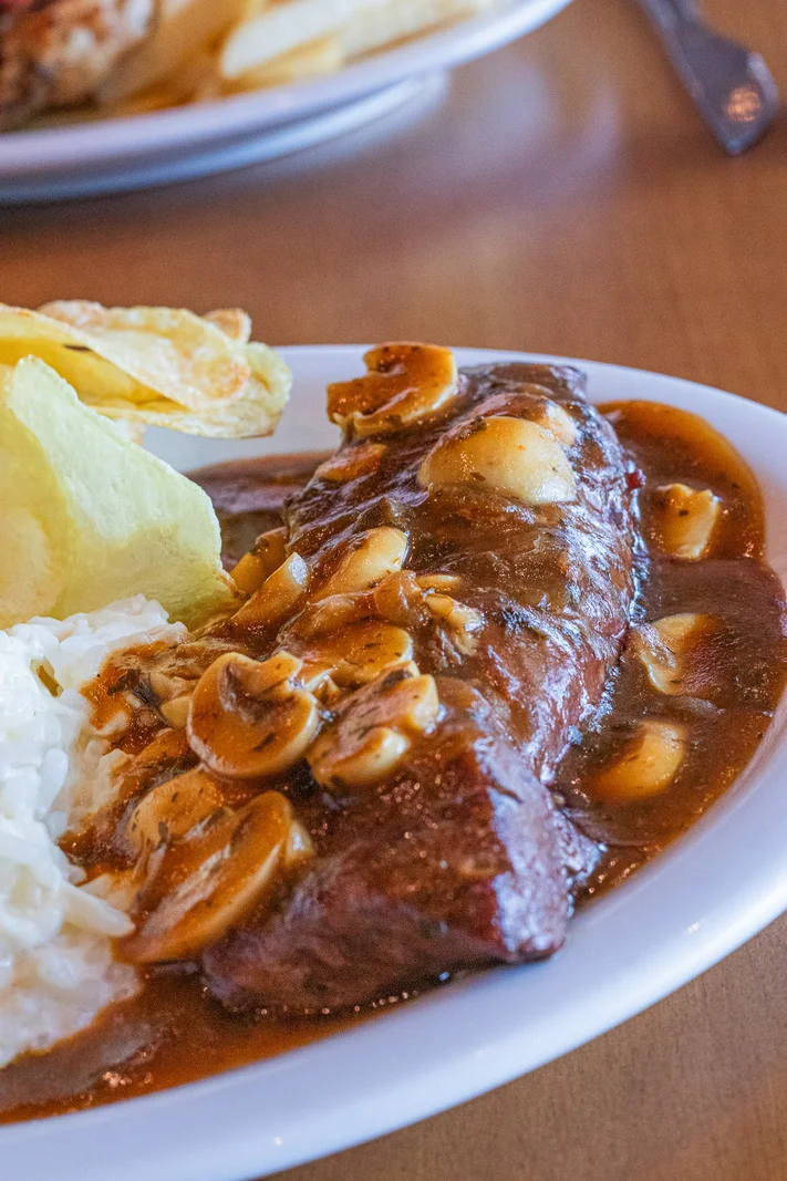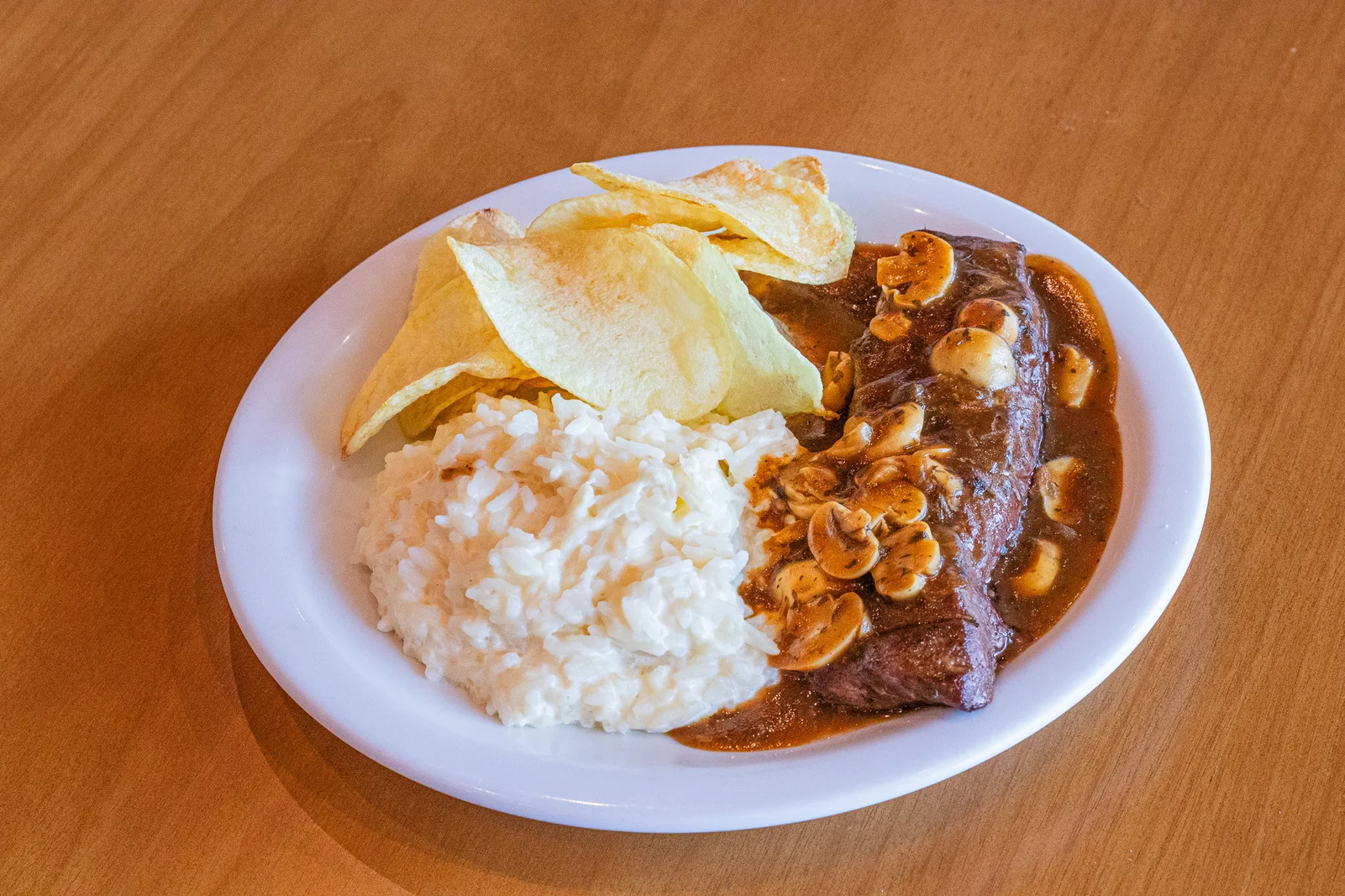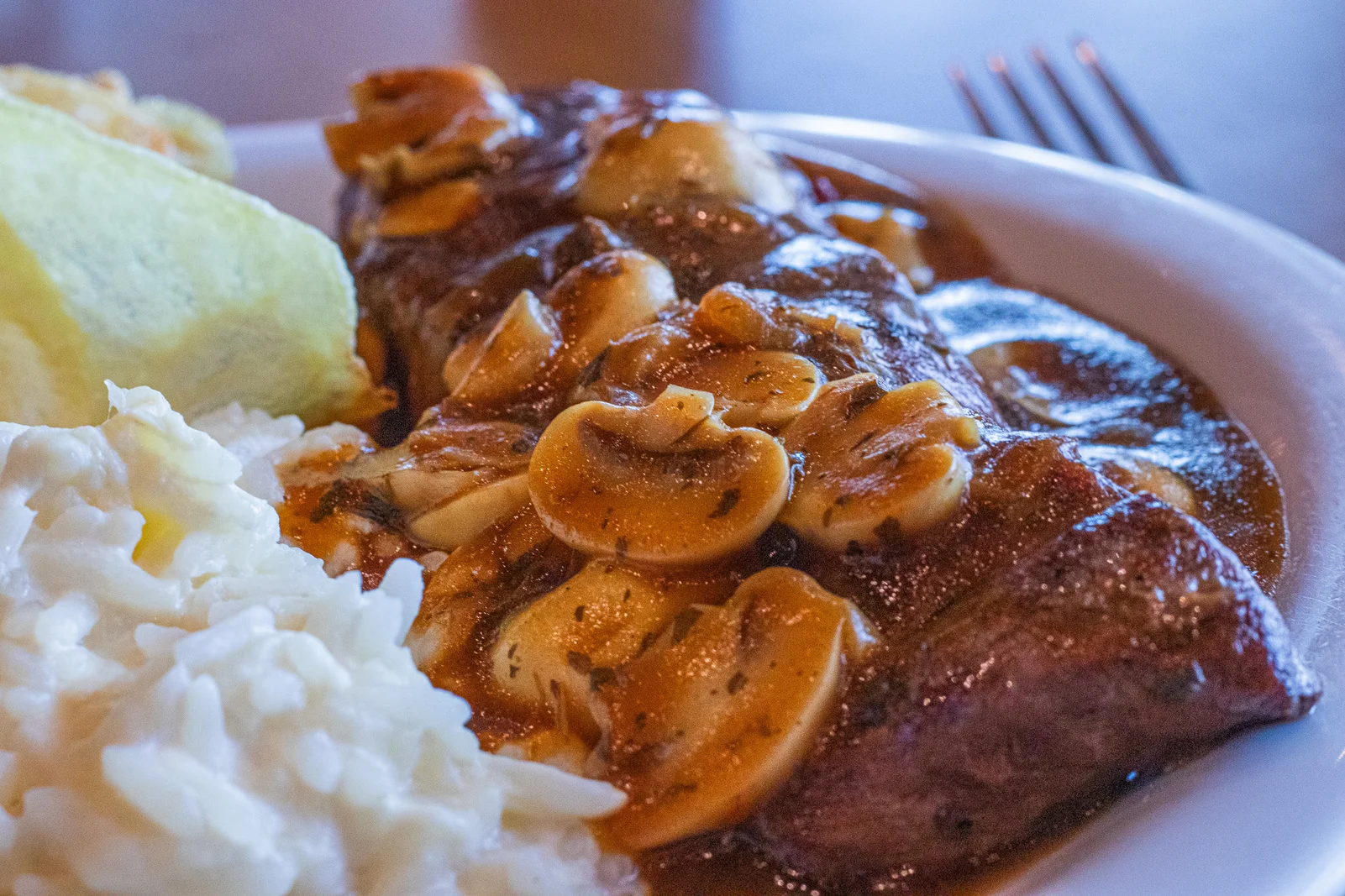 Shoulder ao molho madeira, acompanhado de arroz à piamontese e batata portuguesa