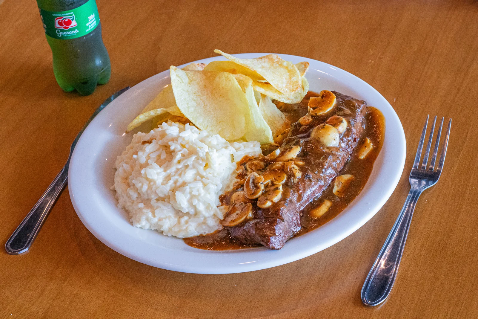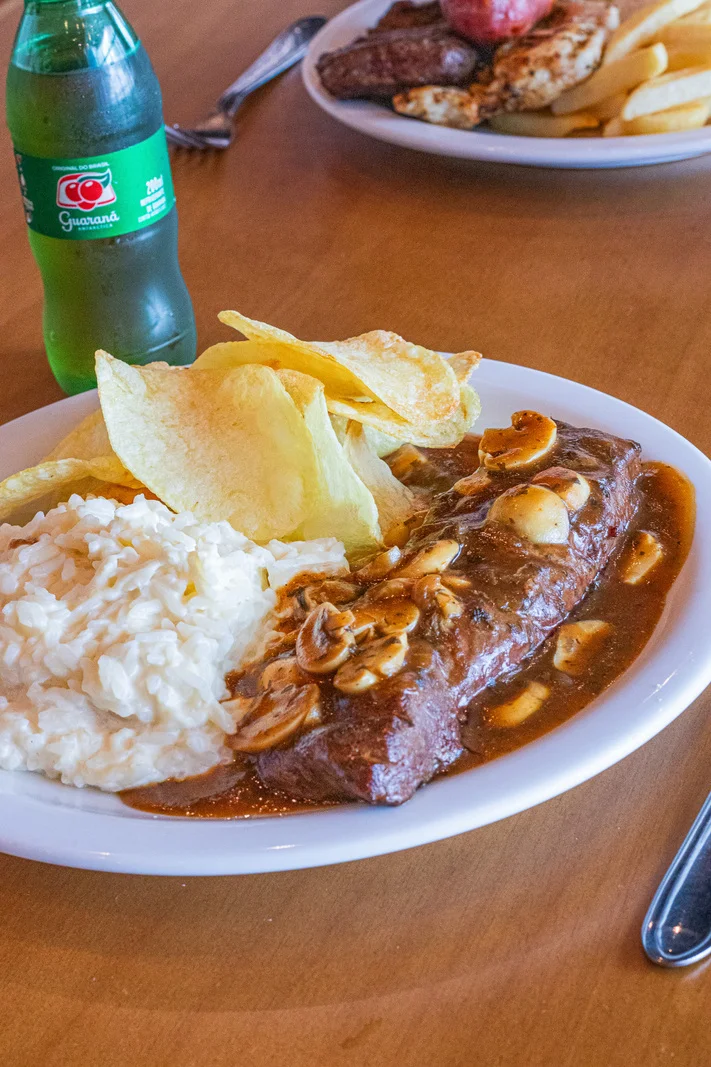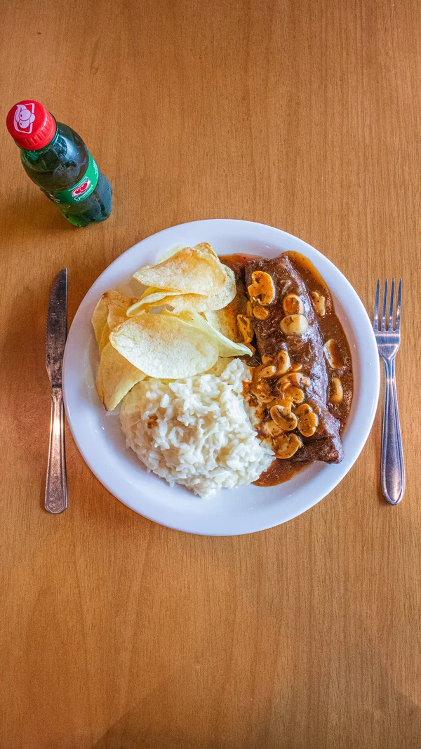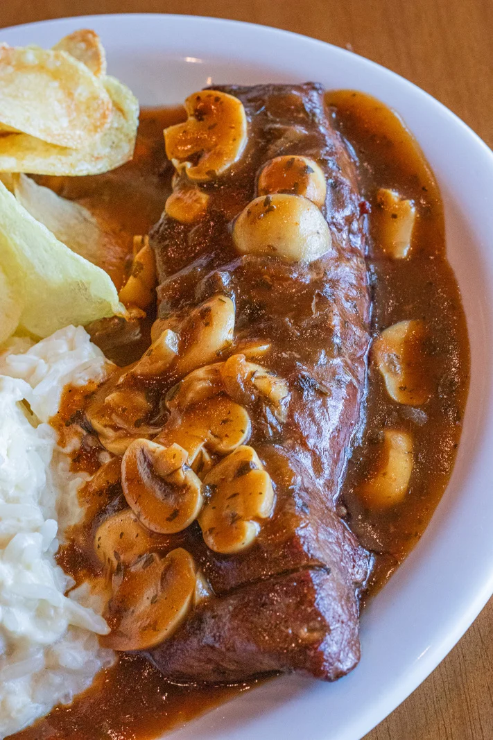 Shoulder ao molho madeira, acompanhado de arroz à piamontese e batata portuguesa
