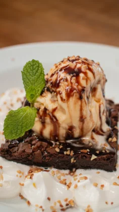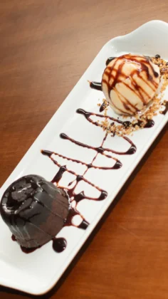 Duas bananas assadas com queijo acompanhadas de duas bolas de sorvete de creme e finalizada com calda de doce de leite e canela