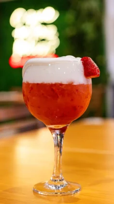 Refrescante drink de gin com morango, água tônica, xarope de morango e gengibre, e espuma de gengibre