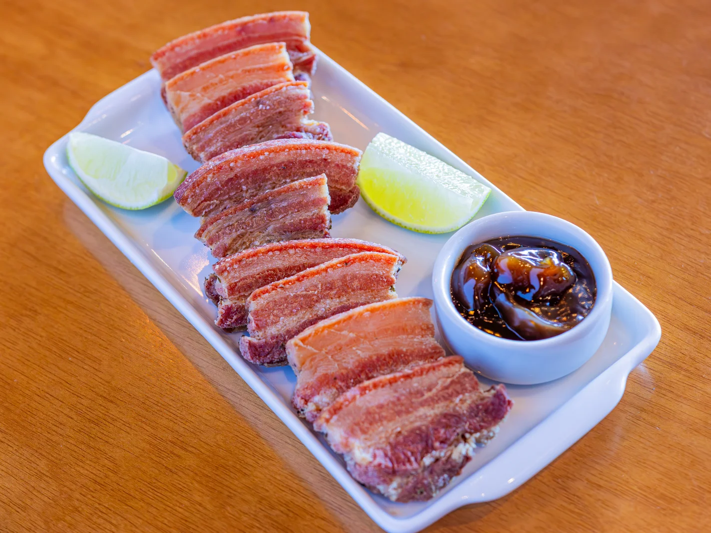 Panceta crocante pururucada servida com molho barbecue da casa